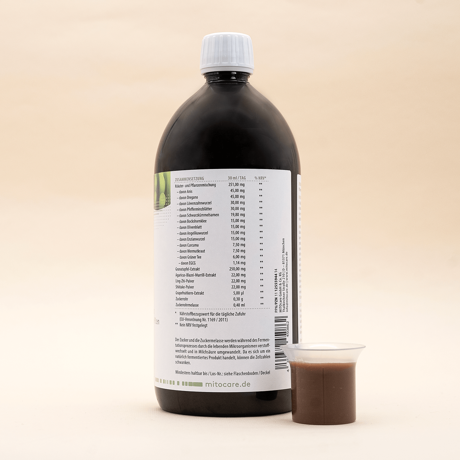 Zutaten: Wasser; Zuckerrohrmelasse und Zuckerarten aus Zuckerrohr (die Melasse und Zuckerarten werden während des Fermentationsprozesses von den effektiven Mikroorganismen verbraucht und in Milchsäure umgewandelt); Granatapfel-Extrakt; Ling Zhi, Grapefruitkern-Extrakt; Shiitake; Agaricus blazei murrill; Kräuter- und Pflanzenmischung; effektive Mikroorganismen