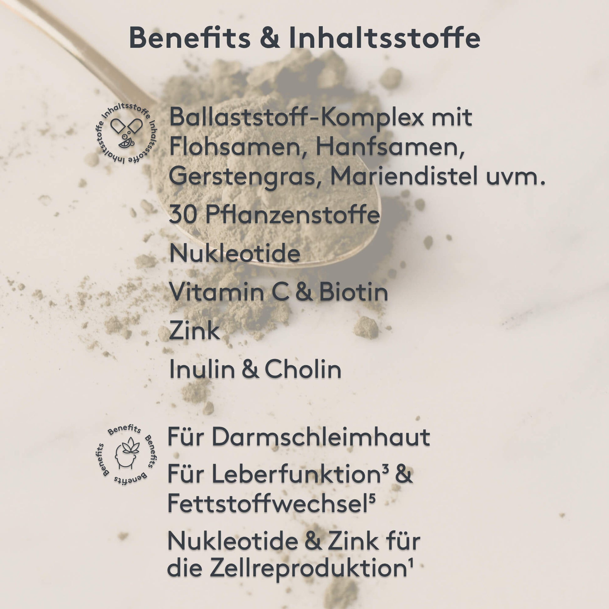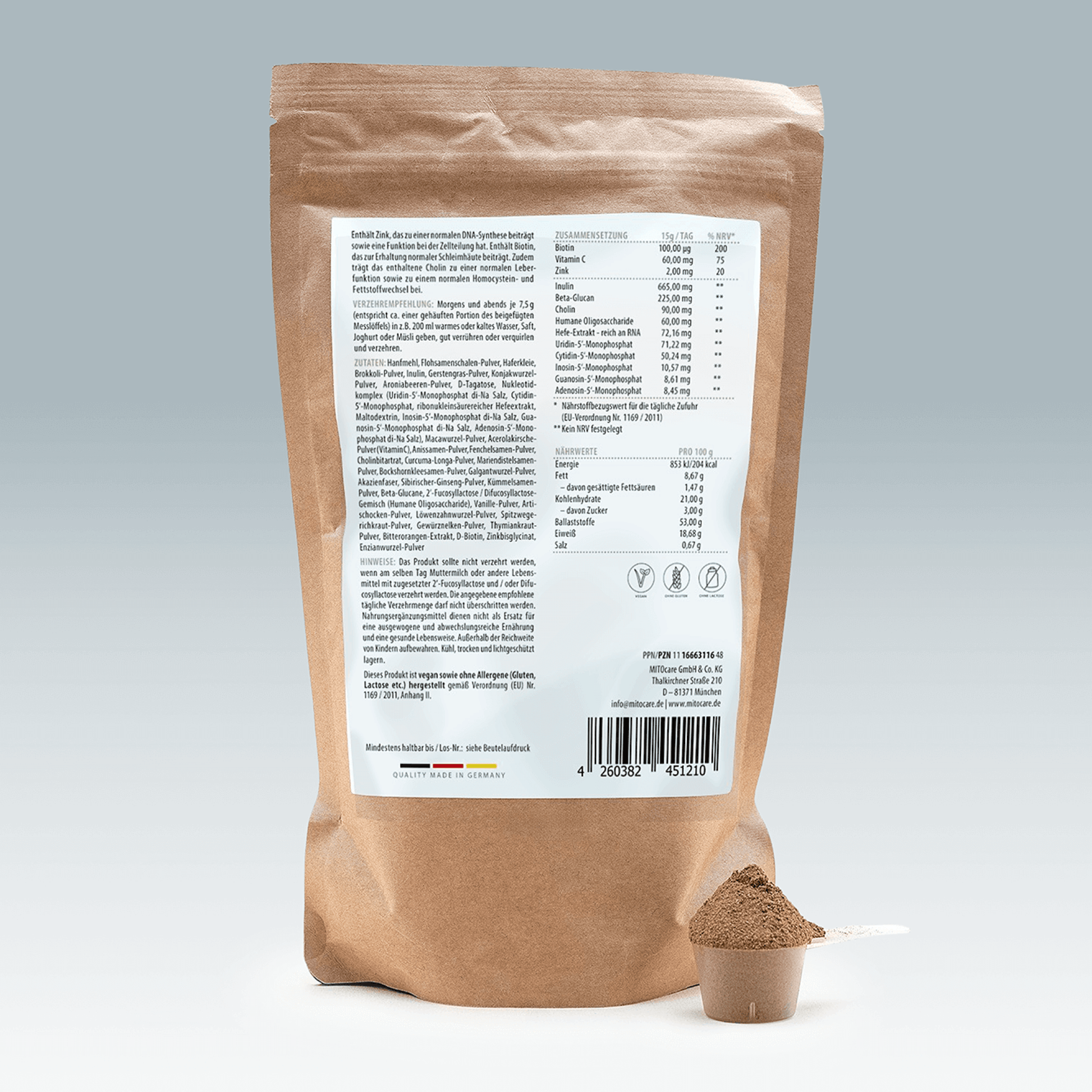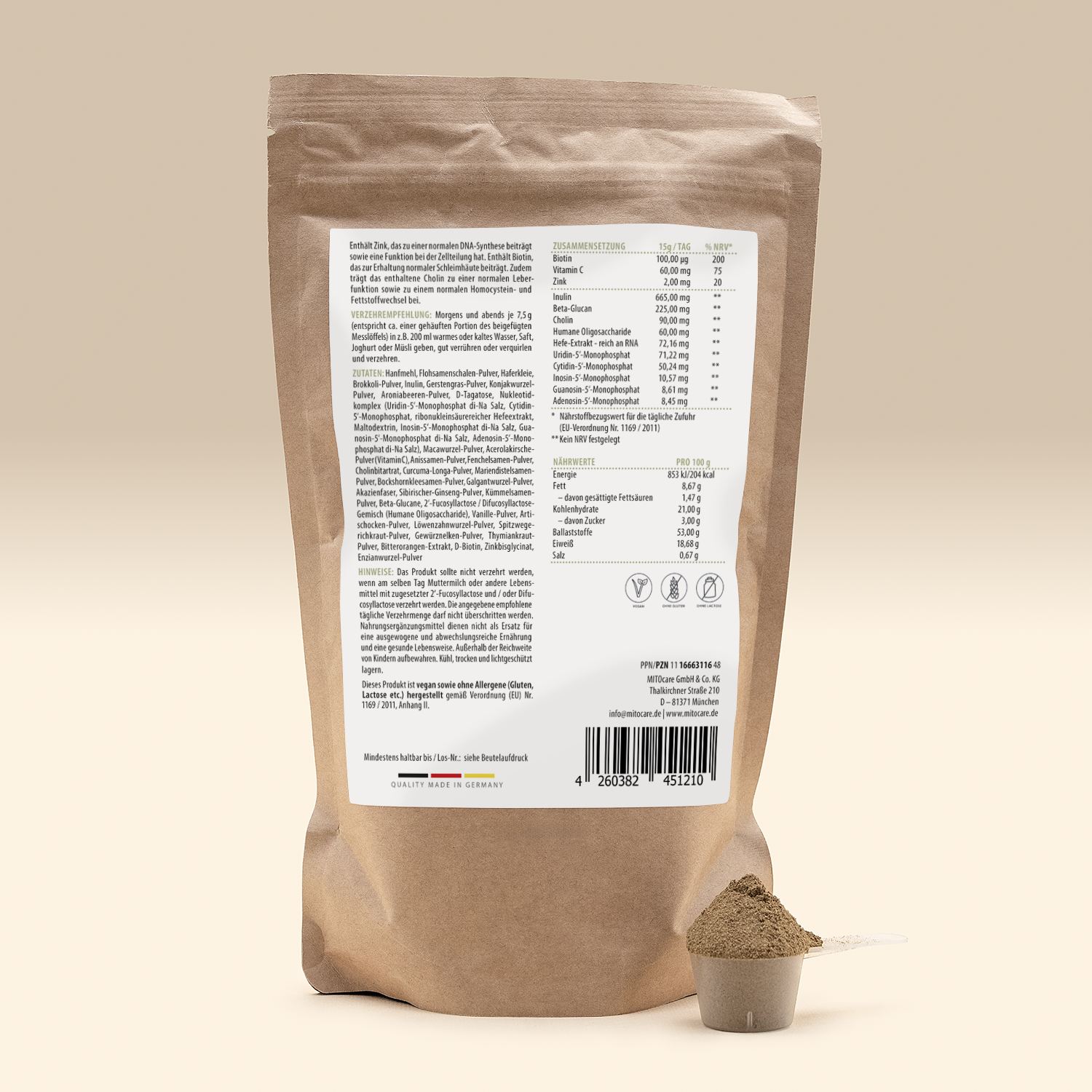 Zutaten: Hanfmehl, Flohsamenschalen-Pulver, Haferkleie, Brokkoli-Pulver, Inulin, Gerstengras-Pulver, Konjakwurzel-Pulver, Aroniabeeren-Pulver, D-Tagatose, Nukleotidkomplex (Uridin-5‘-Monophosphat di-Na Salz, Cytidin-5‘-Monophosphat, ribonukleinsäurereicher Hefeextrakt, Maltodextrin, Inosin-5‘-Monophosphat di-Na Salz, Guanosin-5‘-Monophosphat di-Na Salz, Adenosin-5‘-Monophosphat di-Na Salz), Macawurzel-Pulver, Acerolakirsche-Pulver (Vitamin C), Anissamen-Pulver, Fenchelsamen-Pulver, Cholinbitartrat, Curcuma-Longa-Pulver, Mariendistelsamen-Pulver, Bockshornkleesamen-Pulver, Galgantwurzel-Pulver, Akazienfaser, Sibirischer-Ginseng-Pulver, Kümmelsamen-Pulver, Beta-Glucane, 2‘-Fucosyllactose / Difucosyllactose-Gemisch (Humane Oligosaccharide), Vanille-Pulver, Artischocken-Pulver, Löwenzahnwurzel-Pulver, Spitzwegerichkraut-Pulver, Gewürznelken-Pulver, Thymiankraut-Pulver, Bitterorangen-Extrakt, D-Biotin, Zinkbisglycinat, Enzianwurzel-Pulver