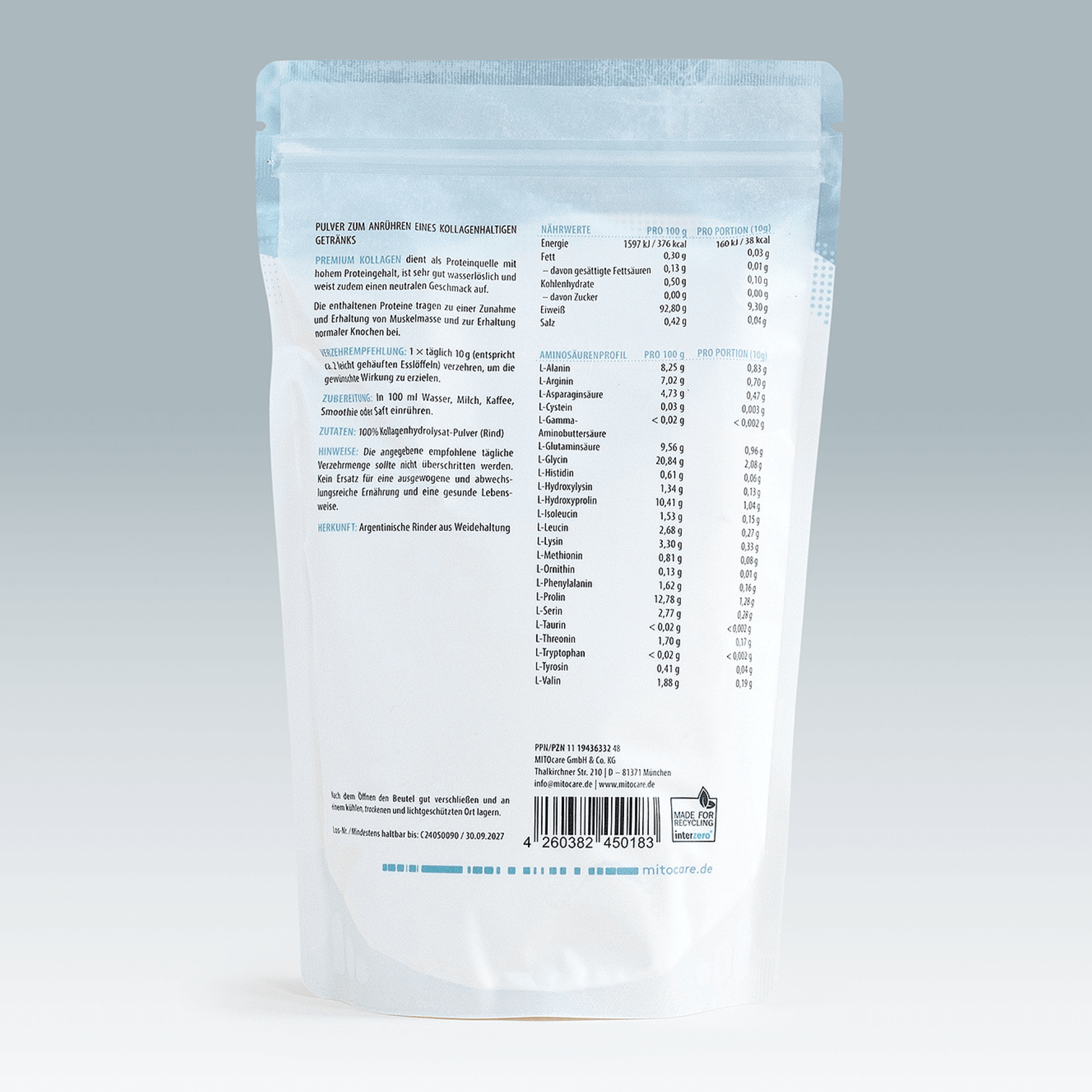 Zutaten: 100% Rinderkollagenhydrolysat-Pulver (von Rindern aus argentinischer Weidehaltung)