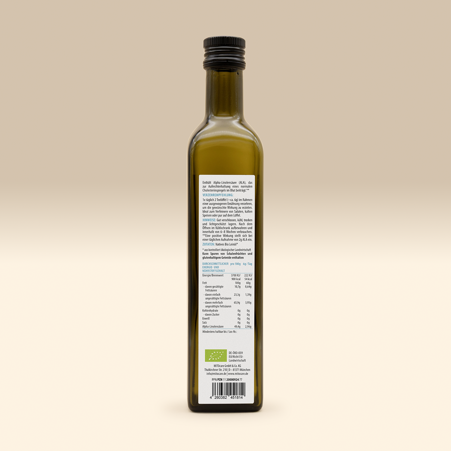 Unser mühlenfrisches, natives Bio Leinöl bietet ein ausgewogenes Spektrum aus acht verschiedenen Fettsäuren, die durch die schonende, biologische Verarbeitung in ihrer natürlichen Form erhalten bleiben. Es eignet sich ideal für die kalte Küche – zum Beispiel als Zutat in Salatdressings, im Müsli oder in Smoothies – sollte jedoch aufgrund seiner Oxidationsempfindlichkeit nicht zum Anbraten verwendet werden.