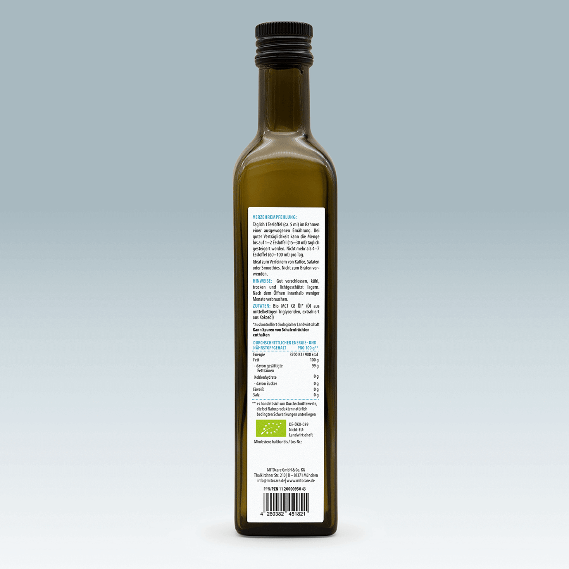 Aufgrund der Geschmacks- und Geruchsneutralität lässt sich unser Bio MCT C8 Öl hervorragend mit Kaffee oder Wasser mischen und passt ideal zu Smoothies, Säften, Shakes oder Salatdressings. Beim Erhitzen kann MCT-Öl jedoch einen scharfen oder bitteren Geschmack entwickeln, weshalb es nicht zum Braten, Frittieren oder Erhitzen verwendet werden sollte.