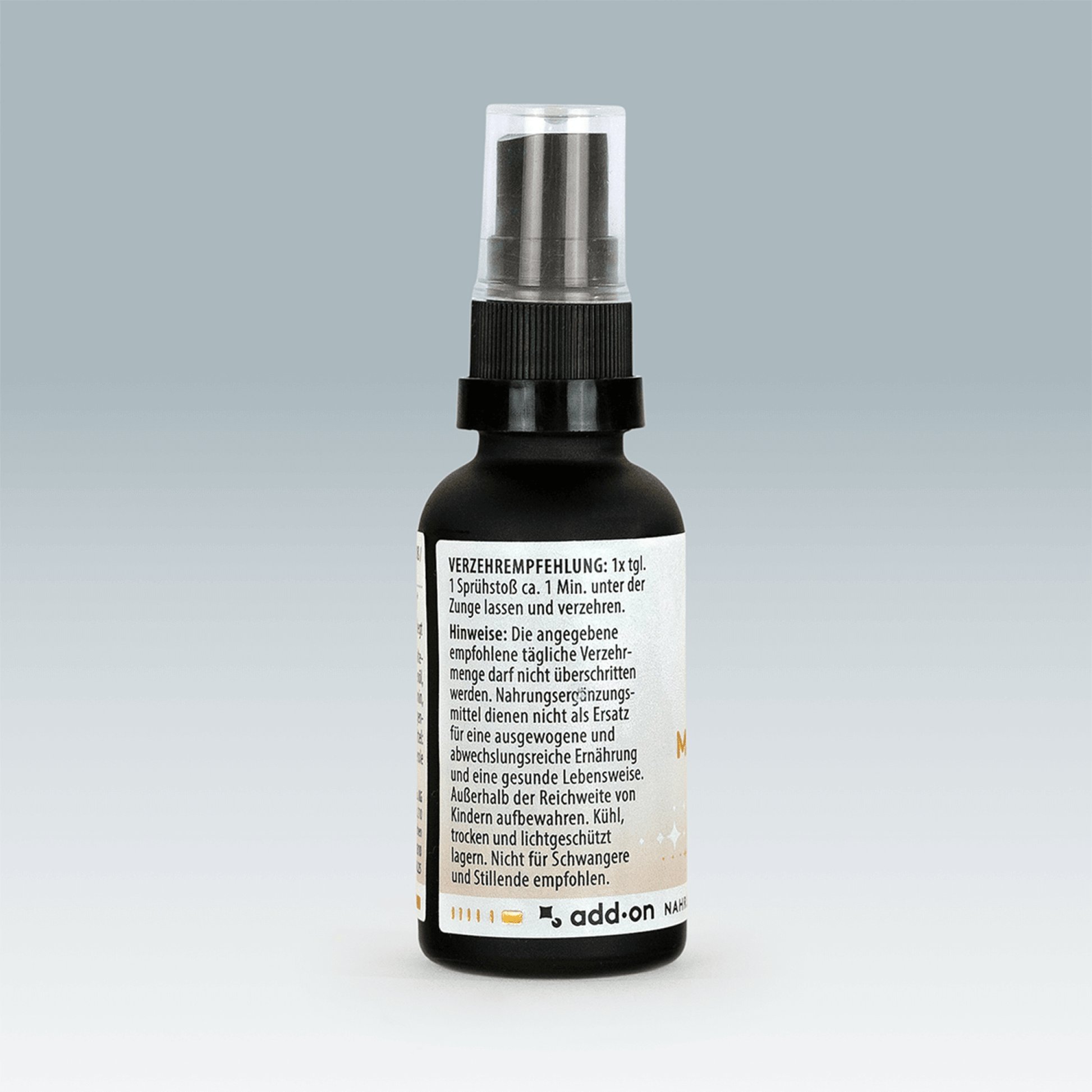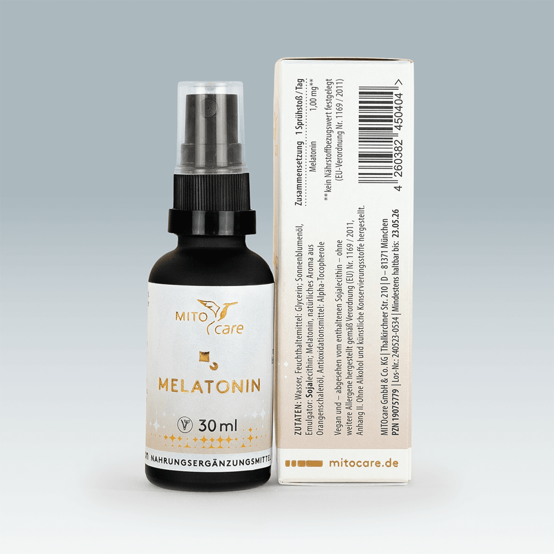 Unser MITOcare add·on Melatonin wurde speziell für eine schnell wirkende Verkürzung der Einschlafzeit entwickelt1. Die positive Wirkung stellt sich bereits ein, wenn kurz vor dem Schlafengehen 1mg Melatonin (1 Sprühstoß) aufgenommen wird. Auch subjektive Jetlag-Empfindungen können durch Melatonin gelindert werden2, wovon auch Menschen in Schichtarbeit profitieren können.