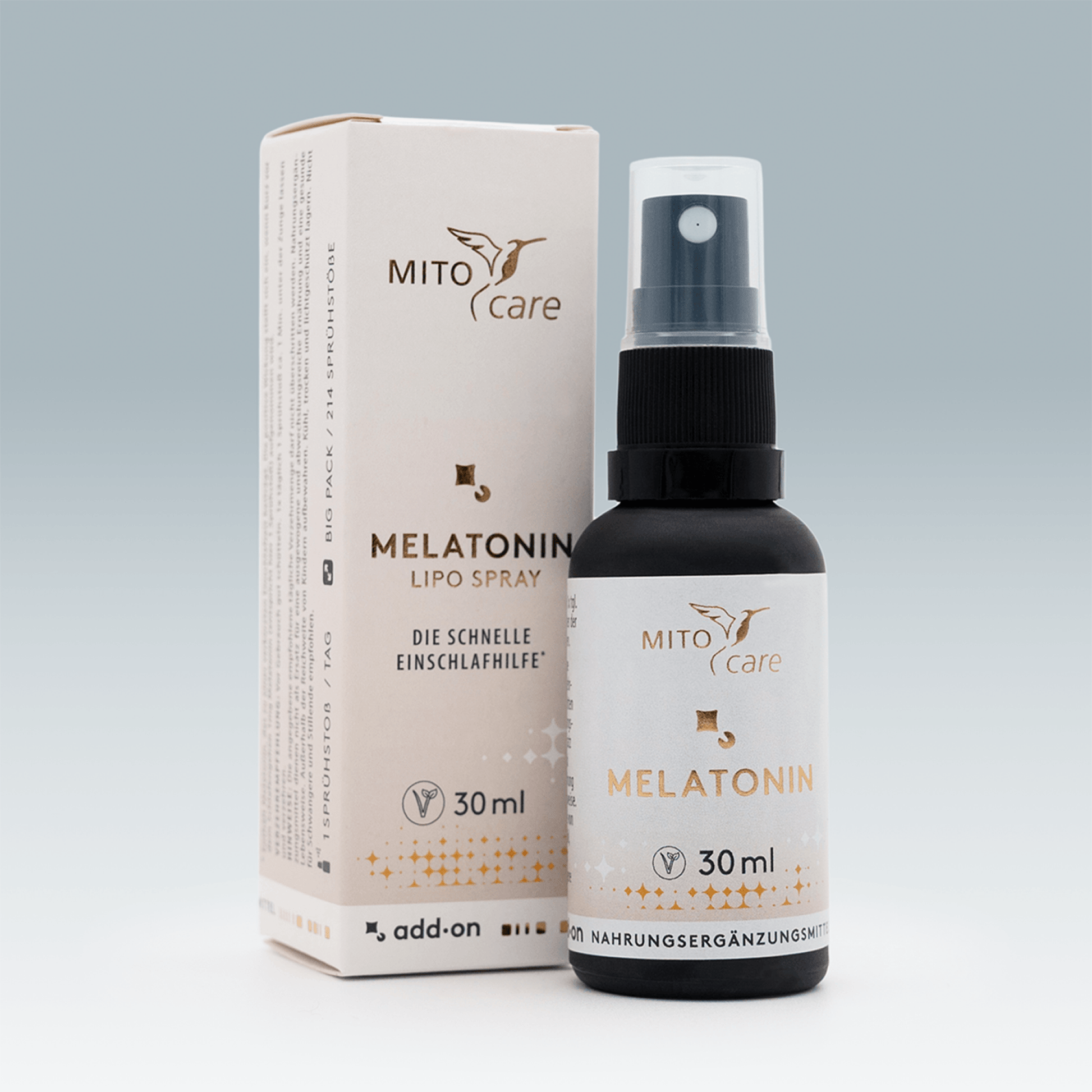 Unser MITOcare add·on Melatonin wurde speziell für eine schnell wirkende Verkürzung der Einschlafzeit entwickelt1. Die positive Wirkung stellt sich bereits ein, wenn kurz vor dem Schlafengehen 1mg Melatonin (1 Sprühstoß) aufgenommen wird. Auch subjektive Jetlag-Empfindungen können durch Melatonin gelindert werden2, wovon auch Menschen in Schichtarbeit profitieren können.