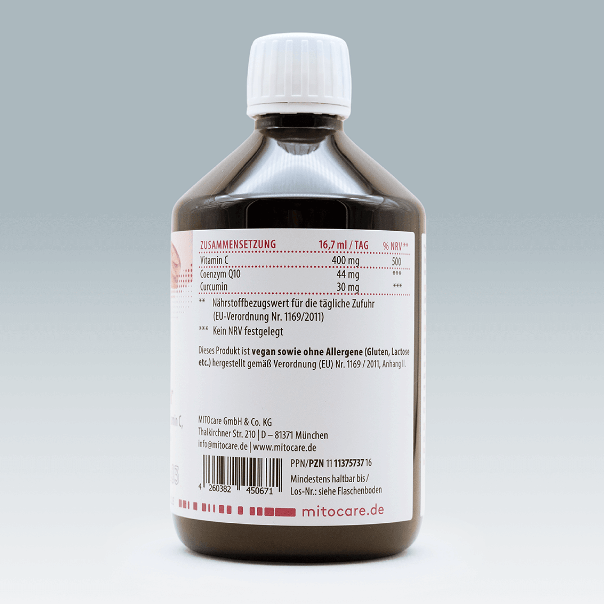 In unserem MITO Booster kommt eine spezielle Mizellen-Technologie zum Einsatz. Durch hydrophile und lipophile Anteile werden die Voraussetzungen für eine optimierte Aufnahme der enthaltenen Nährstoffe im Körper geschaffen. Das Coenzym Q10 ist Akteur der oxidativen Phosphorylierung über welche ca. 90% der gesamten Körperenergie (ATP = Adenosintriphosphat) erzeugt wird. Interessanterweise weisen Organe mit hohem Energiebedarf wie Herz, Leber und Lunge auch die höchste Q10-Konzentration im Körper auf. In den 50-er Jahren wurde Q10 erstmals im Rinderherzen entdeckt. Hier begann die Erforschung dieses Coenzyms. 1978 gelang dann der große Durchbruch, als dem britischen Wissenschaftler Peter Mitchell der Nobelpreis für Chemie zur Erforschung von Q10 verliehen wurde. Er konnte die herausragende Bedeutung von körpereigenem Q10 für die Zellenergiegewinnung nachweisen. Auch enthält unser MITO Booster den sekundären Pflanzenstoff Curcumin aus der Gelbwurz, welche seit Jahrtausenden in der Ayurveda bekannt und hochgeschätzt ist. Der hohe Anteil an Vitamin C rundet diese Rezeptur ab, fungiert als Antioxidants3 und leistet seinen Beitrag für Leistungsfähigkeit und Vitalität in Phasen intensiver körperlicher4 und geistiger5 Betätigung. Zudem erhöht es die Eisenaufnahme6, welche essenziell für die Sauerstoffversorgung sämtlicher Zellen im Körper ist.