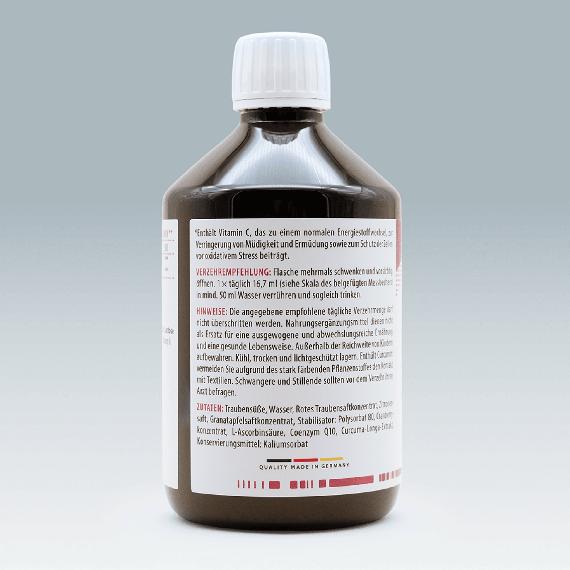 Zutaten: Traubensüße, Wasser, Rotes Traubensaftkonzentrat, Zitronensaft, Granatapfelsaftkonzentrat, Stabilisator: Polysorbat 80, Cranberrykonzentrat, L-Ascorbinsäure (Vitamin C), Coenzym Q10, Curcuma-Longa-Extrakt, Konservierungsmittel: Kaliumsorbat