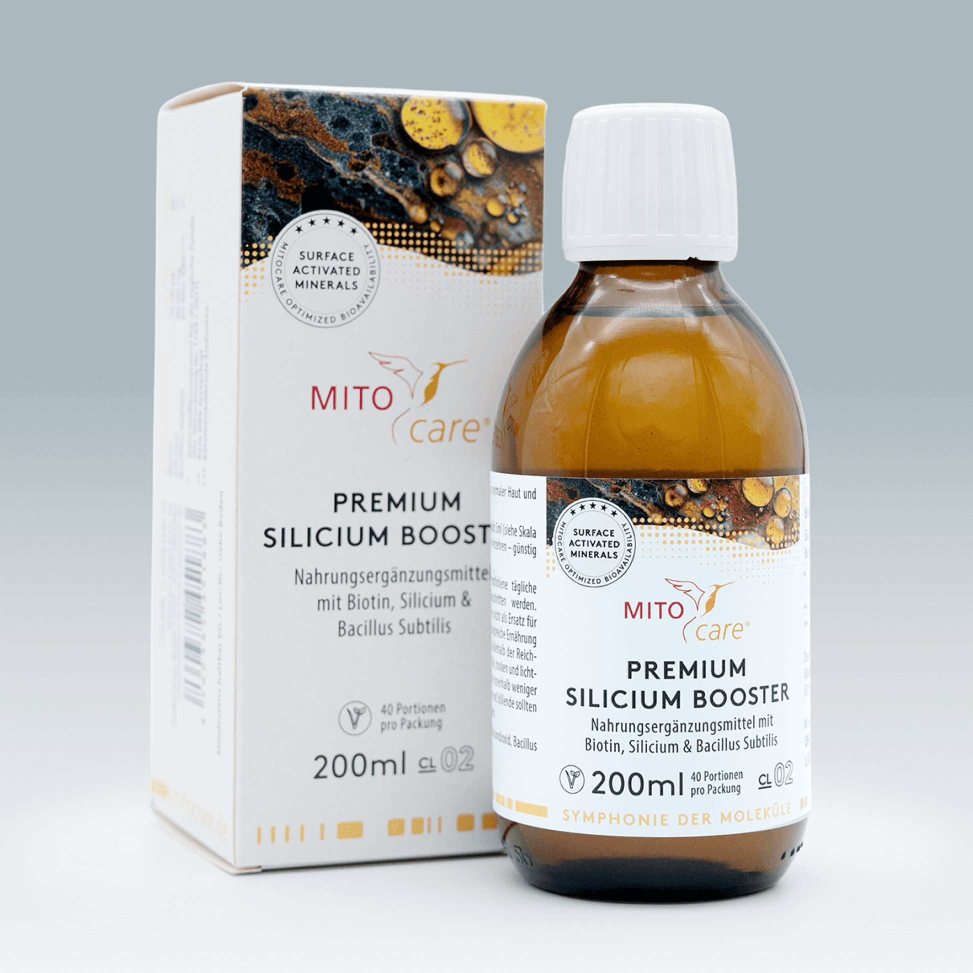 Unser Premium Silicium Booster liefert flüssiges Silicium in feiner, aktivierter Form. Durch das spezielle SAM-Verfahren (Surface Activated Minerals) wird die Oberflächenstruktur des Siliciums gezielt vergrößert und aktiviert, was die Reaktionsfähigkeit und Löslichkeit deutlich erhöhen kann. Das aktivierte Silicium wird anschließend in MCT-Öl aus Kokos eingebettet, das als Trägerstoff die Bioverfügbarkeit weiter optimiert. Ergänzt wird Silicium durch den Mikroorganismus Bacillus Subtilis, welcher - ebenso wie Silicium - natürlicherweise im Boden, aber auch häufig im menschlichen Verdauungstrakt vorkommt. Durch das enthaltene Biotin unterstützt das Produkt gesunde Haut1, Haare2 und Schleimhäute3 und wirkt im Energiestoffwechsel4 mit.