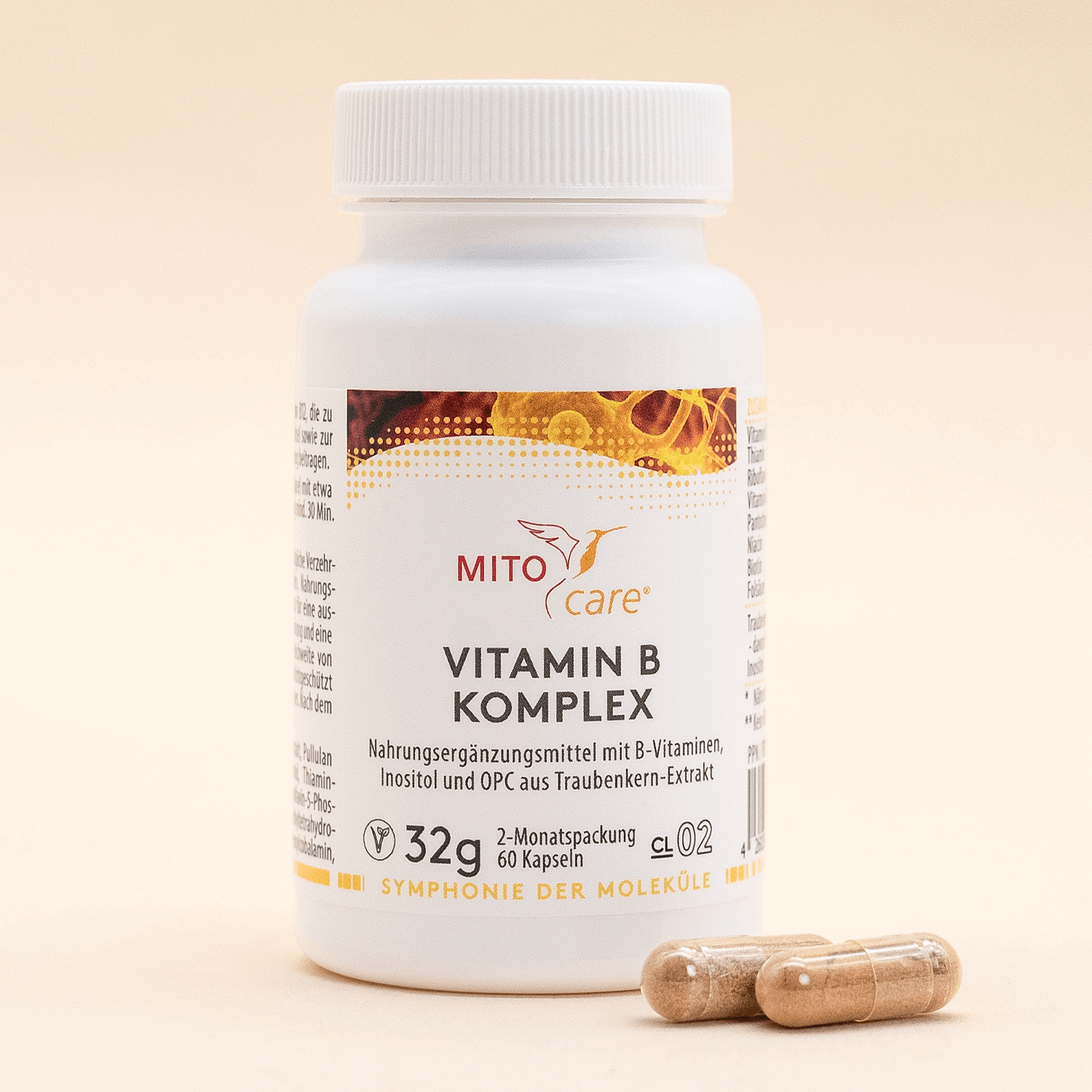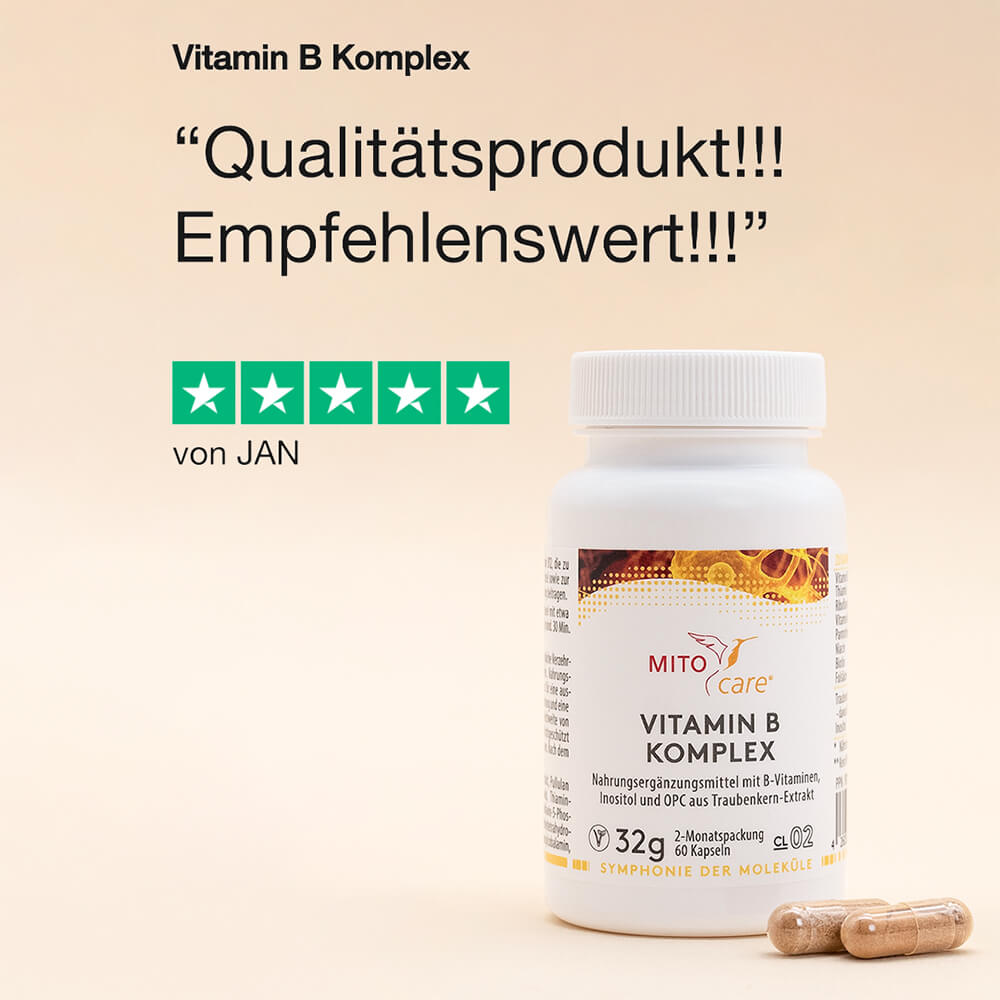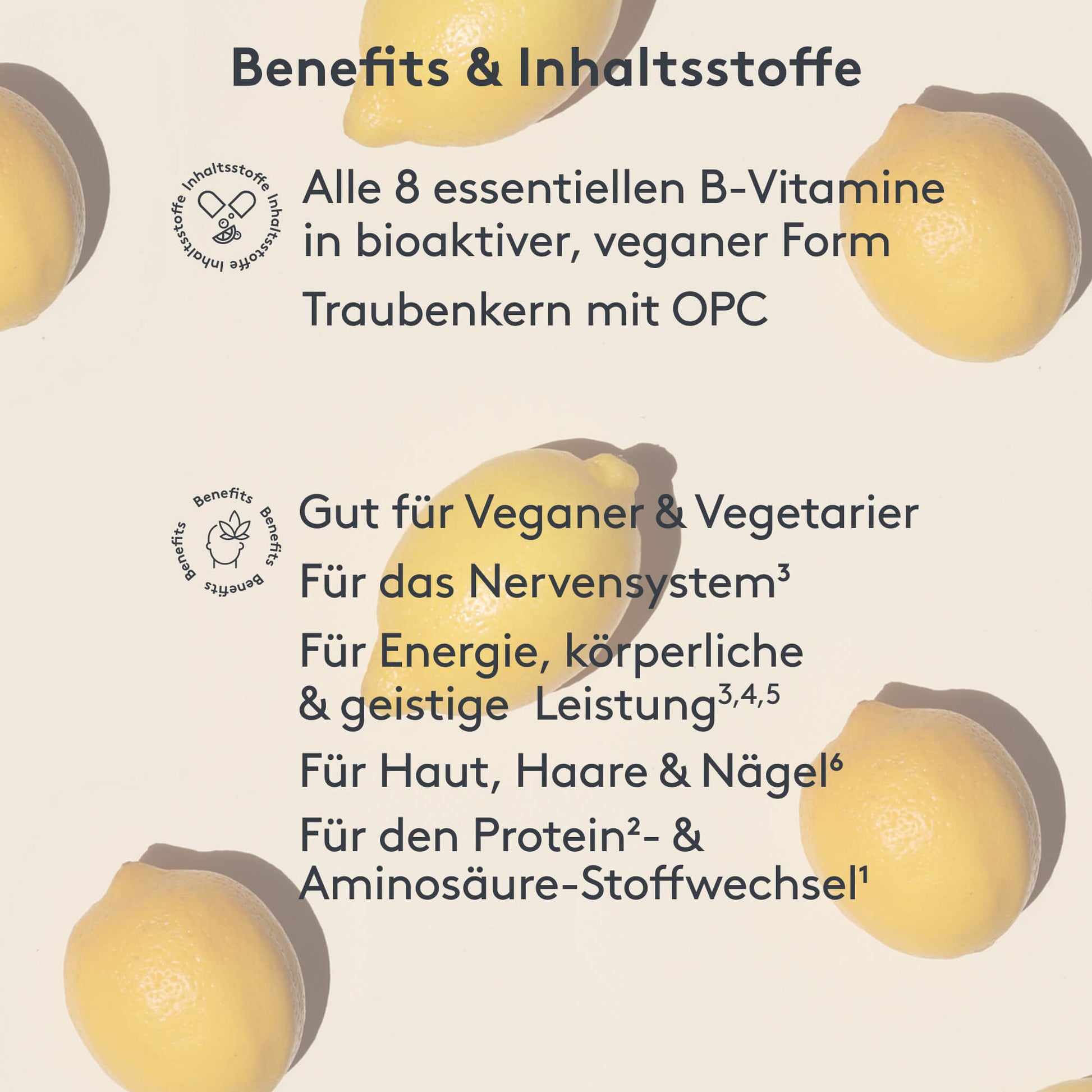 Der Vitamin B Komplex vereint alle acht essenziellen B-Vitamine und besticht vor allem durch den Einsatz der rein bioaktiven Formen des Vitamin B6 und der Folsäure sowie der zwei am meist geschätzten bioaktiven Formen (Methylcobalamin und Adenosylcobalamin) des wichtigen Vitamin B12. Diese drei B-Vitamine tragen zum wichtigen Homocystein-Stoffwechsel bei.1 Homocystein ist ein Abfallprodukt des Eiweißstoffwechsels, welches gebunden und umgewandelt bzw. ausgeschieden werden muss. Da der Körper B-Vitamine nicht selbst herstellen kann, müssen diese über die Nahrung aufgenommen werden. Neben dem Effekt auf Nervensystem3, geistige Leistung4 und die psychische Funktion3 unterstützt dieses Produkt zusätzlich die Erhaltung von Haut, Haaren und Schleimhäuten.6
