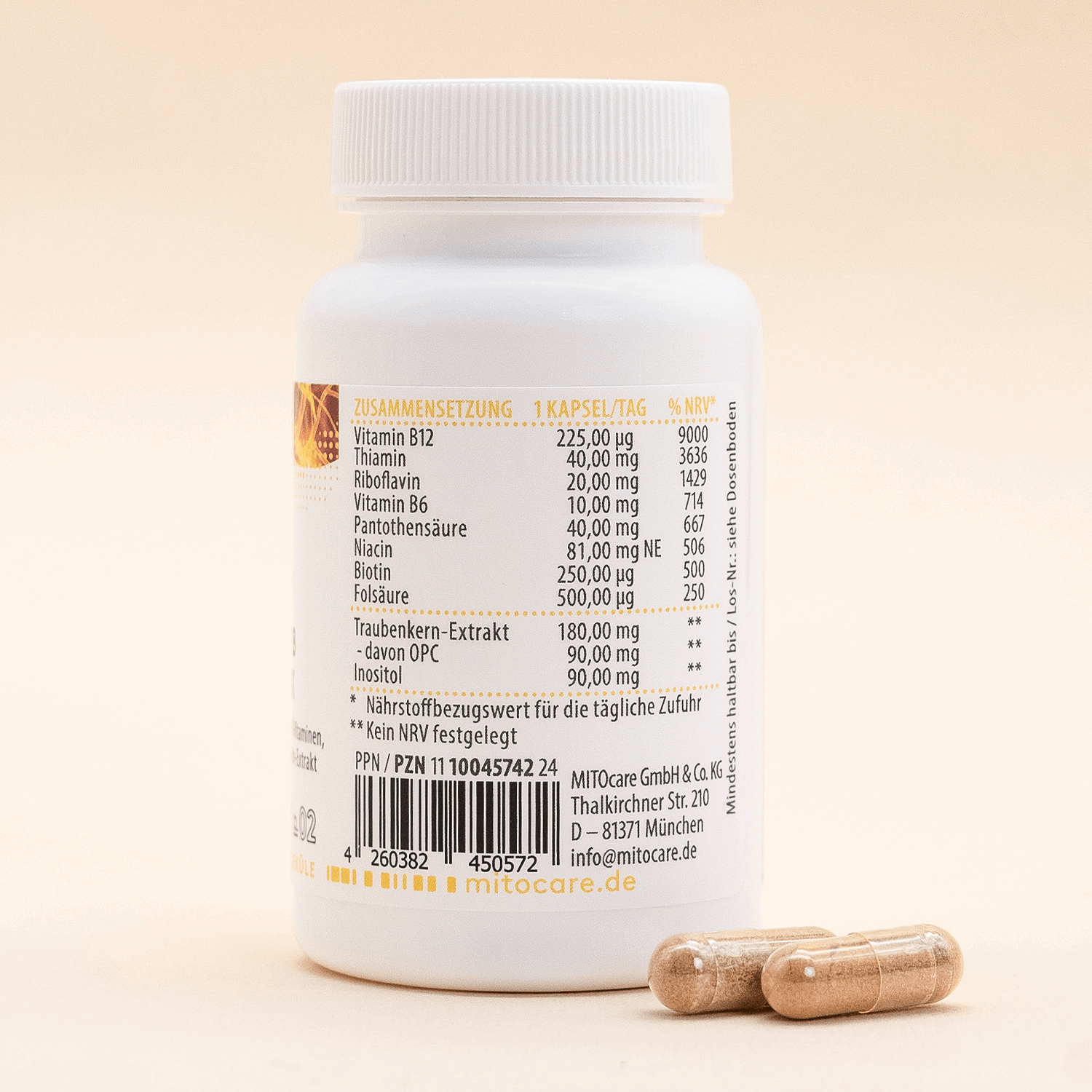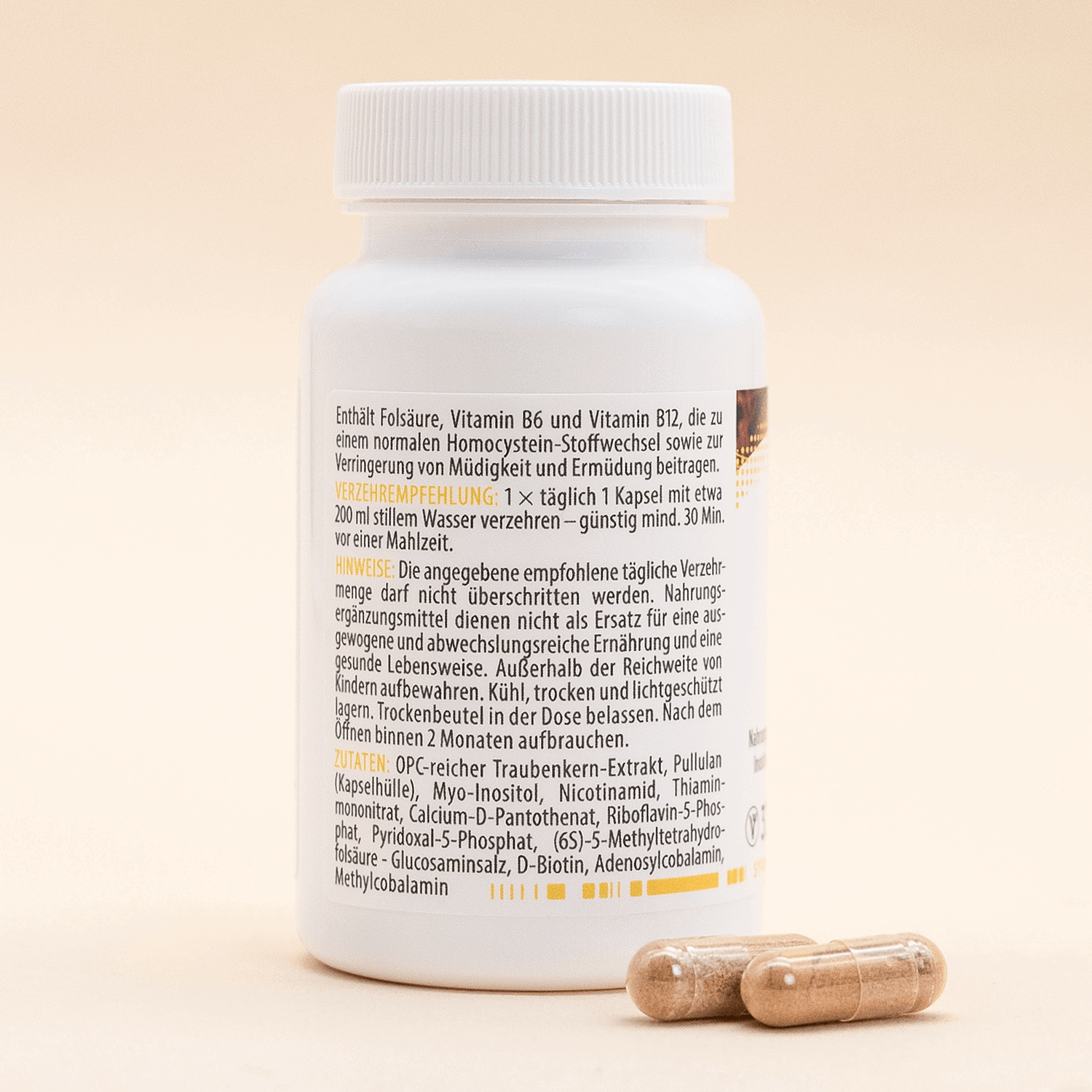 Zutaten: OPC-reicher Traubenkern-Extrakt, Pullulan (Kapselhülle Gr.0), Myo-Inositol, Nicotinamid (Vitamin B3), Thiaminmononitrat (Vitamin B1), Calcium-D-Pantothenat (Vitamin B5), Riboflavin-5-Phosphat (Vitamin B2), Pyridoxal-5-Phosphat (Vitamin B6), (6S)-5-Methyltetrahydrofolsäure - Glucosaminsalz, D-Biotin, Adenosylcobalamin (Vitamin B12), Methylcobalamin (Vitamin B12)